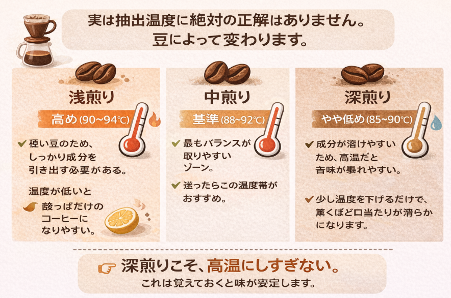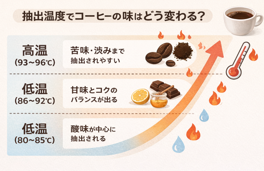 お湯の温度が変わるだけで、抽出される成分のバランスが大きく変化します。